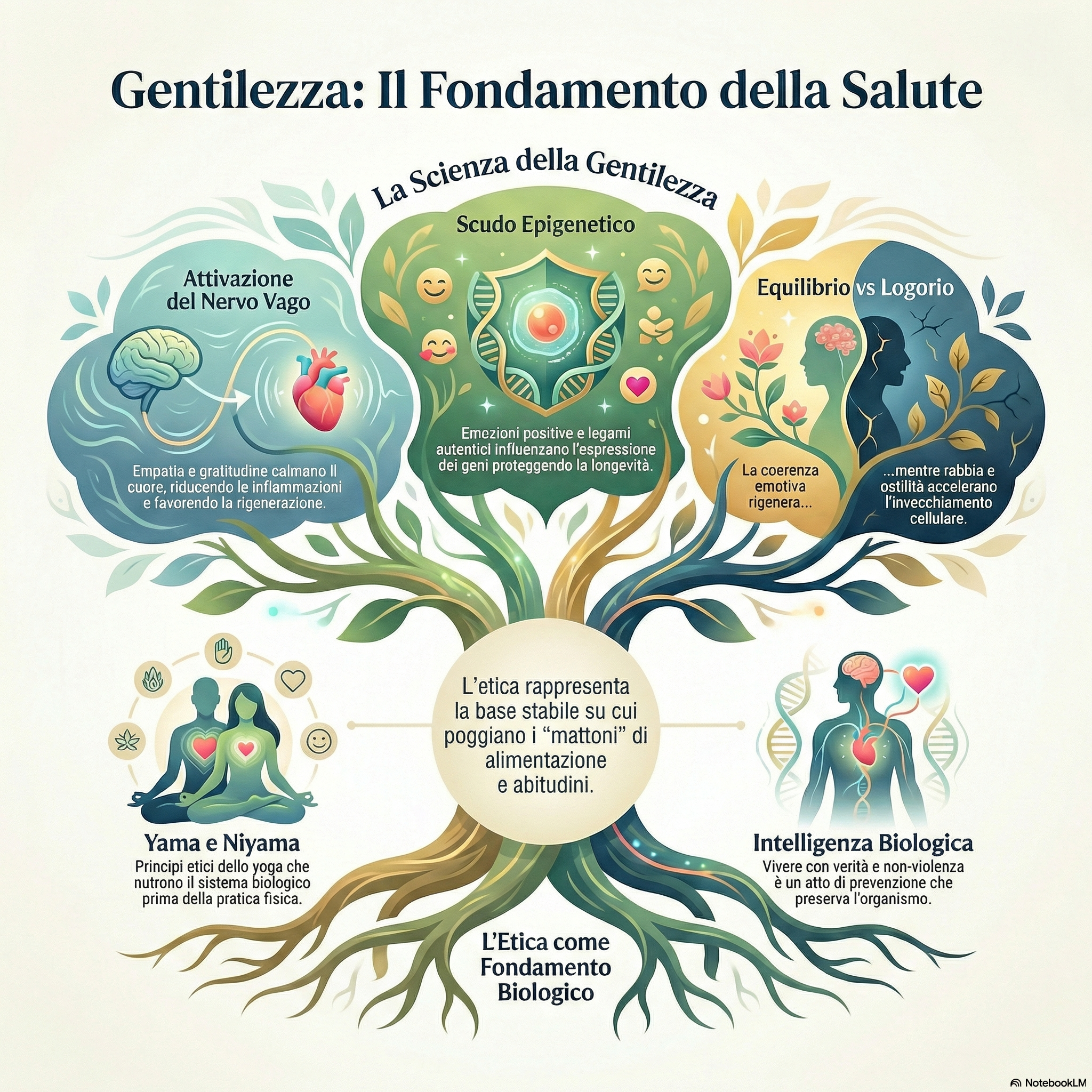 Immaginiamo la salute come una casa: alimentazione e abitudini sono i mattoni, ma l’etica sono le fondamenta. Quando viviamo in conflitto, sotto stress o in costante reazione, il terreno emotivo si indebolisce. Al contrario, la gentilezza consolida le basi, dona stabilità e rende la struttura capace di durare nel tempo.